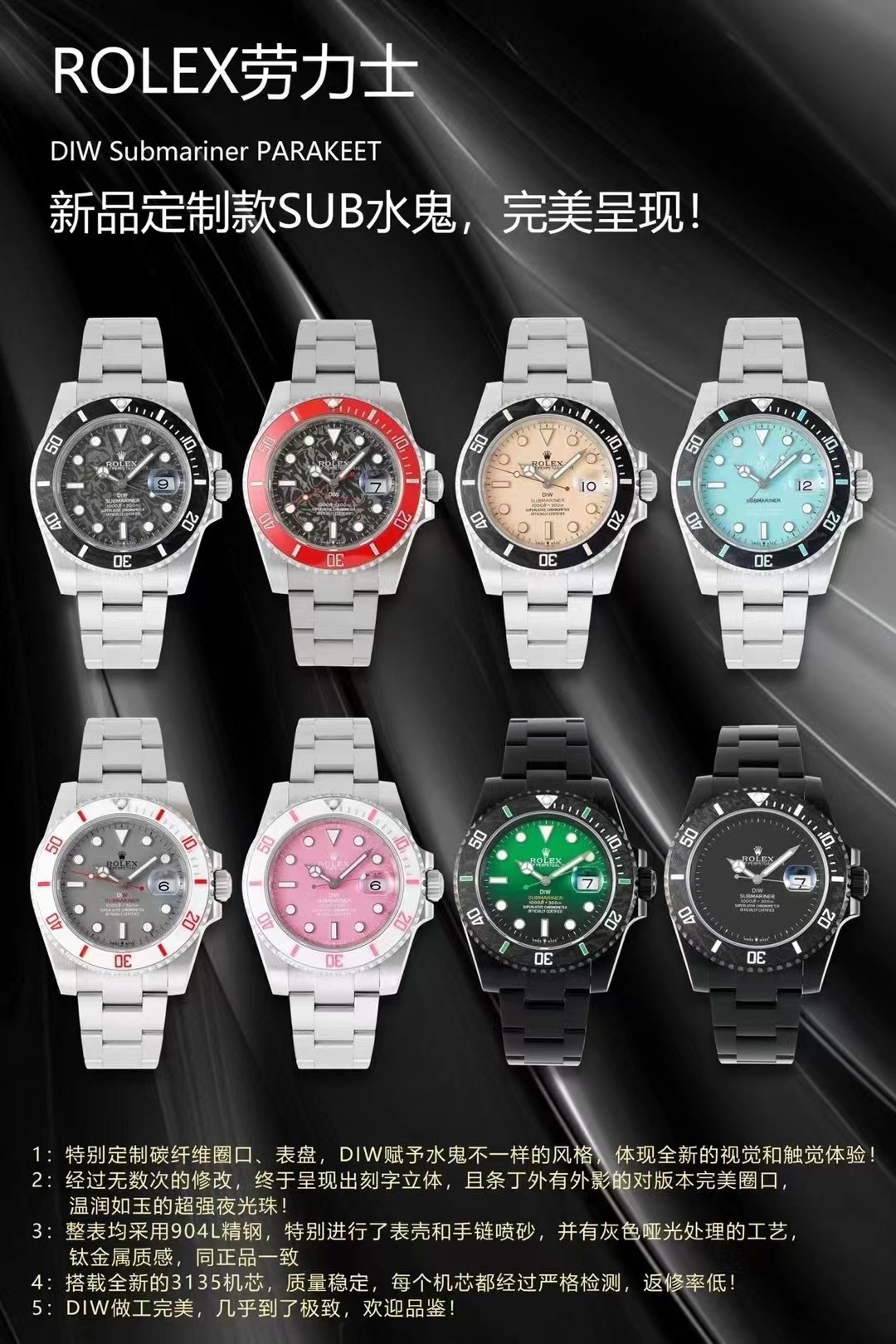 Rolex Rolexrolex Diw Submariner Parakeet Sub Watch Dial,diw Luminous 904l Case ,titanium 3135 movement